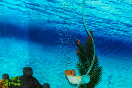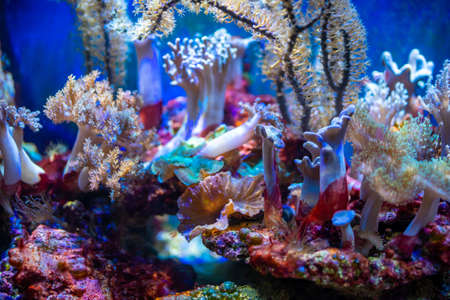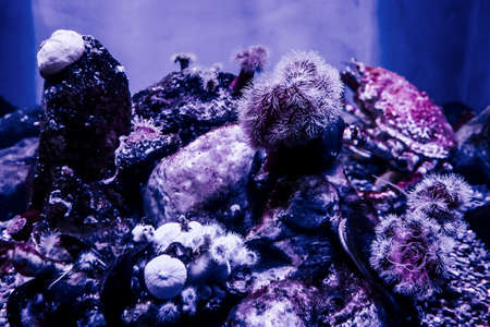Reef tank, marine aquarium. Blue aquarium full of plants. Tank filled with water for keeping live underwater animals.