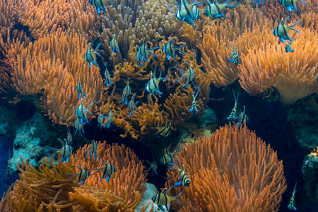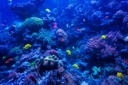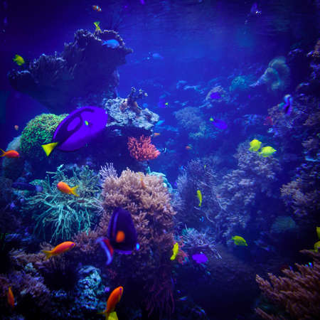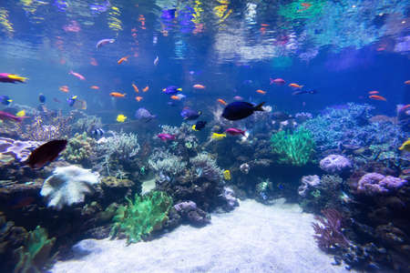 tropical fishes meet in blue coral reef sea water aquarium. Underwater paradise
