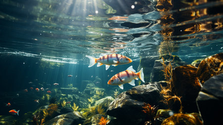 Fish move gracefully through clear water, surrounded by shimmering light reflections. Sunlight filters down, creating a tranquil underwater atmosphere.