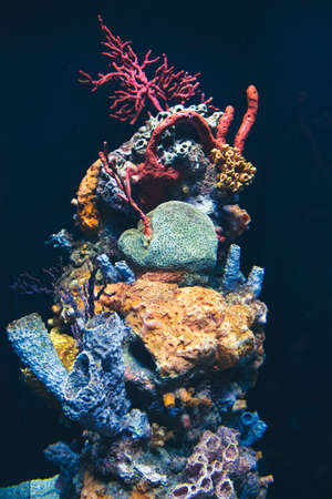 Colorful vertical coral reef, piled high to create a display in an aquarium.