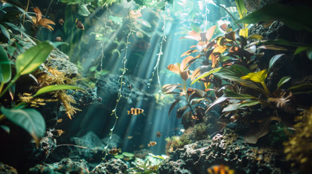 An underwater scene in an aquarium, featuring colorful fish swimming amidst rocks and lush aquatic plants, with sunbeams streaming through the water. The setting is lively and vibrant.