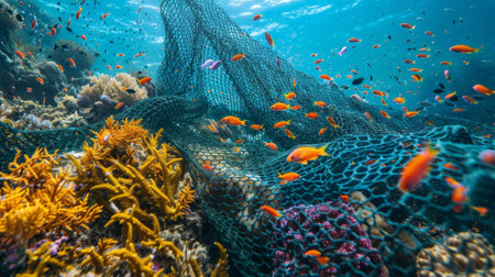 A vibrant coral reef surrounded by sustainable fishing nets demonstrating the importance of conservation efforts