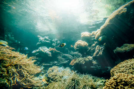 Transparent water ocean or sea, corals and fish underwater, seascape. Environmental protection, the problem of ocean and nature pollution. Advertising for a travel agency, pet store, veterinary clinic, phone screensaver, beautiful pictures, puzzles