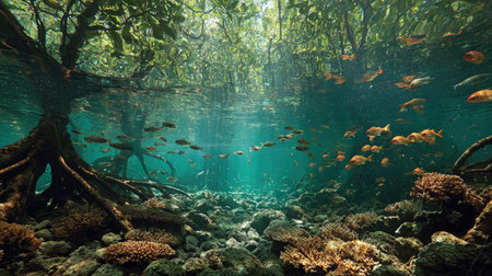 A serene underwater scene showcasing vibrant tropical fish swimming among mangrove roots, illuminating the clear ocean water. Light beams filter through the surface, revealing a stunning underwater ecosystem filled with rich biodiversity. Perfect for nature lovers and underwater explorers.