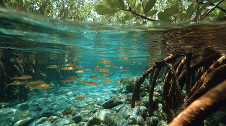 This captivating underwater scene captures tropical fish swimming gracefully among mangrove roots in crystal clear water, showcasing vibrant colors and natural beauty.