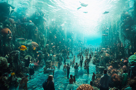 A large group of fish swimming together through an underwater tunnel in a mesmerizing display, A magical underwater kingdom with swirling schools of fish