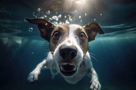 Underwater funny photo of jack russel terrier. Summer vacation with pet. Closeup underwater photo of a dog. Activities, training classes with dogs. Generative AI illustration