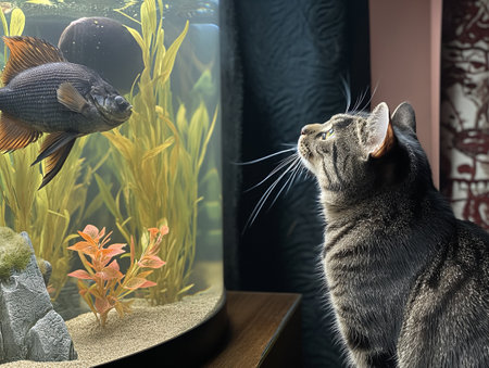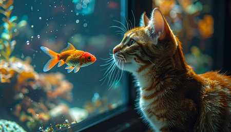A curious tabby cat is mesmerized by the graceful movements of a bright orange goldfish in a beautifully lit aquarium. This quiet moment captures a sense of wonder and the unlikely connection between two very different domestic pets, highlighting themes of curiosity, patience, and fascination.