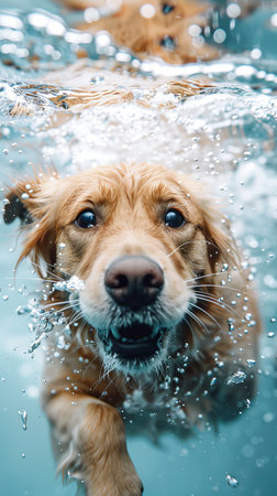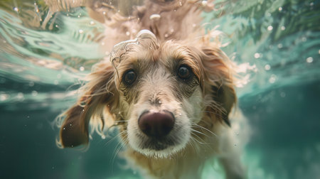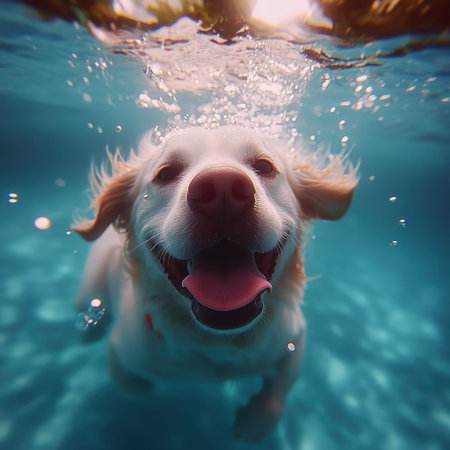 Cheerful dog diving into water, underwater camera capturing its splash and smiling face, energy and fun of the moment highlighted.