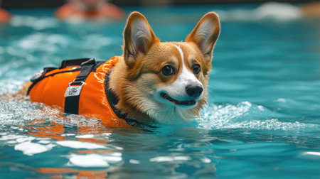 Pet health care through hydrotherapy: Corgi in a life jacket swimming in a pool, engaging in recovery and rehabilitation exercises.