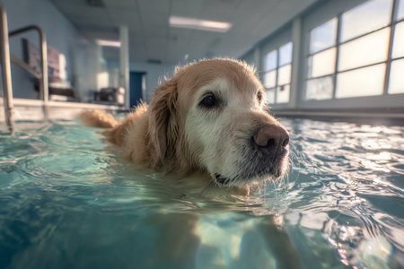 Pet Golden Retriever, Labrador Retriever fitness and therapy session in dog gym, water pool, treadmill, and veterinary-supported exercise for recovery.