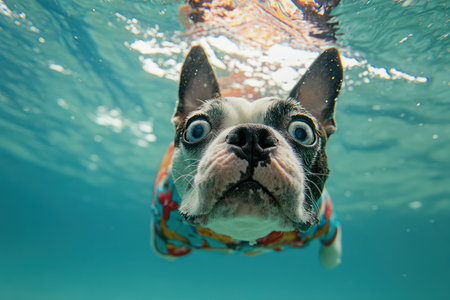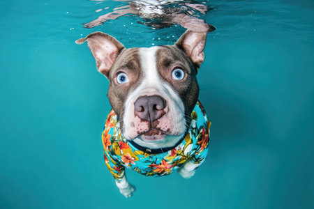 Playful dog wearing a colorful shirt swimming underwater, facing the camera with wide curious eyes in clear blue water.