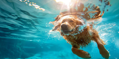 A playful golden retriever dives joyfully underwater, surrounded by sparkling water.