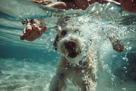 Happy dog happily diving underwater with its owner, having fun together in the summer sun