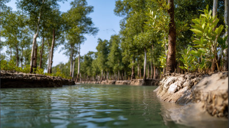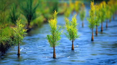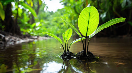 Lush mangrove seedlings emerge from sunlit waters, showcasing nature's resilience and beauty. Ideal for themes of ecosystem, growth, and tranquility.