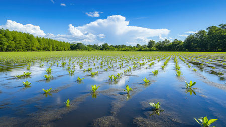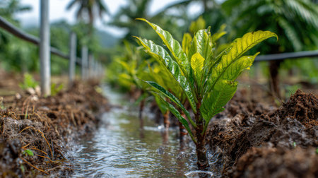 Young cocoa plants thrive in a tropical field, with clear irrigation enhancing their growth. This image captures the essence of sustainable agricultural practices in harmony with nature.