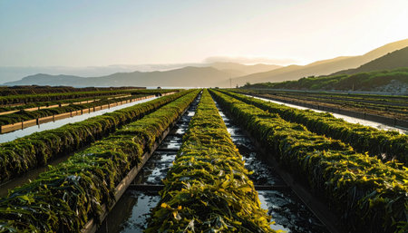 Aerial perspective reveals an extensive seaweed farm with organized rows of vibrant green seaweed thriving in crystal-clear waters.