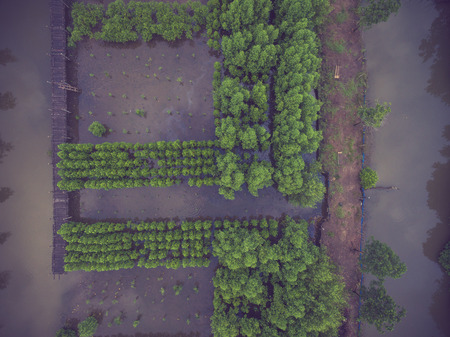 Aerial top view of lush green trees from above in tropical forest in national park in summer season. Natural landscape. Pattern texture background.
