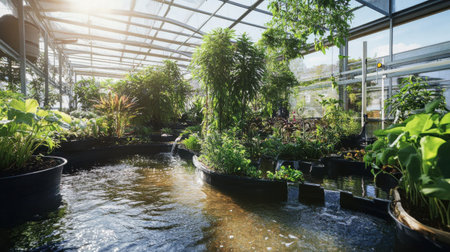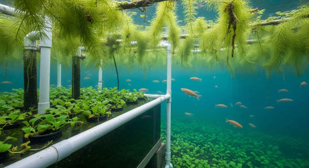 innovative aquaponics farm system, showcasing fish tanks and hydroponic vegetable beds in harmony.