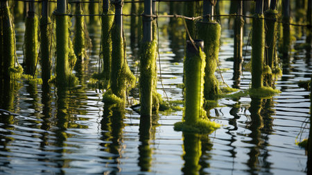 Regenerative Ocean Farming Underwater perspective of sustainable kelp cultivation creating abstract vertical garden in trending blue economy palette without contextual