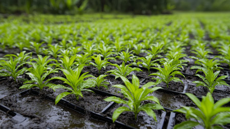 Vibrant Young Seedlings Growing in Rows on a Sunny Day, Capturing the Essence of New Beginnings