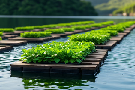 Floating gardens filled with lush green plants on wooden rafts. Calm water reflects surrounding nature, creating a serene environment.