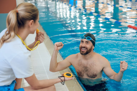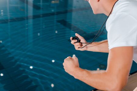 A young swimming coach with a stopwatch in his hand watches the training session near the sports pool.