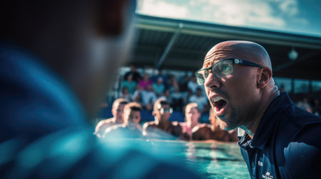 Athlete swimmer diving into outdoor pool water during sunset, creating splash. Focus on arm and water motion with coach visible in background. Concept of sports, training, and competition.