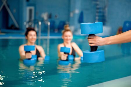 Female swimmers, group aqua aerobics, exercise with dumbbells in the pool. Women in the water, sport swimming fitness training