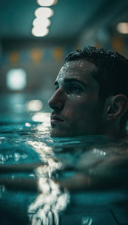 A swimmer enjoys a moment of relaxation in a warm pool after training. The scene captures soft reflections and calming blue tones, creating a cinematic recovery atmosphere.