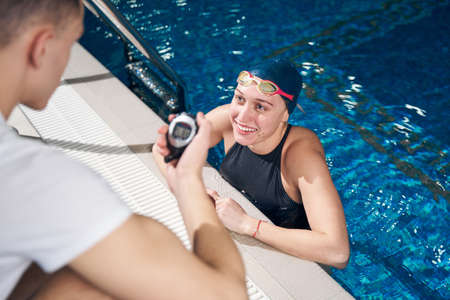 Swimming instructor coach people, woman hold in hand stopwatch during competitions in pool