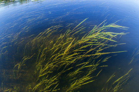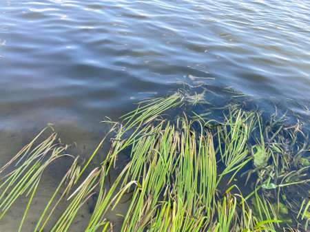 Long green grass in the water on the banks of the river under the summer sun. calm water