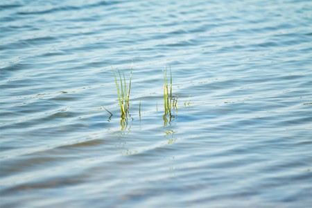 Plants sprouting from under water during high water. Beautiful reflections and shadows on the water.
