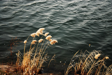 Bulrush stems in blurred dark rippled water with wind waves