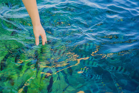 Hand feeds colorful tropical fish in the sea.