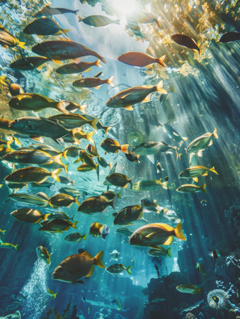 A vibrant underwater scene with a school of fish swimming amidst sunbeams filtering through the water's surface