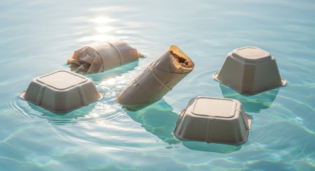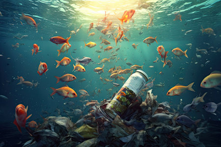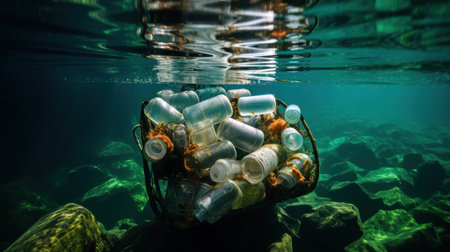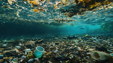 Trash seen in polluted ocean waste floating in illuminated waters image. Concept Polluted Ocean, Trash in Water, Pollution Awareness, Ecological Impact, Marine Environment