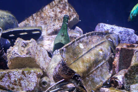 Underwater view of garbage bin with plastic bottles and trash on the bottom