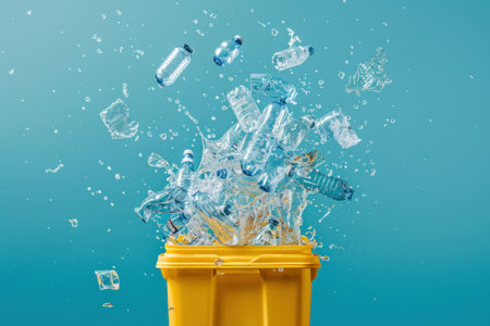 Water splashing from a yellow recycling bin full of plastic bottles, on a bright blue background, symbolizing recycling and environmental awareness