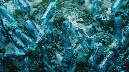 A striking underwater scene showcases discarded plastic bottles floating in clear water, emphasizing pollution and its impact on marine life and the environment.