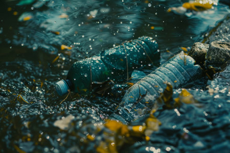 Pollution water bodies is pressing environmental issue, as seen this featuring plastic bottles floating surface of polluted waterway. scene evokes sense of urgency to address waste management
