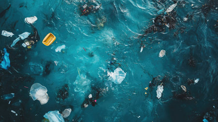 Overhead view of polluted ocean waters, with plastic and trash floating, emphasizing the urgent need for addressing water pollution.