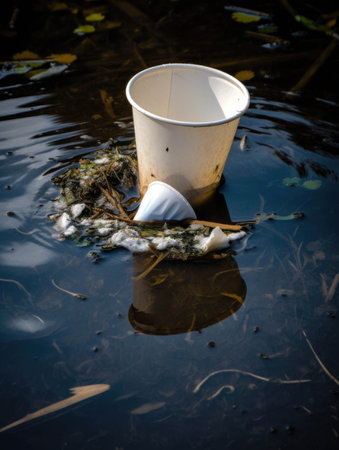 A broken styrofoam cup floating in a polluted lake.. AI generation