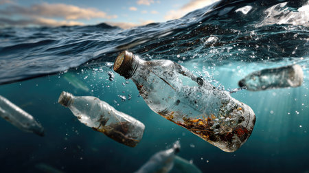 Ocean surface is cluttered with floating plastic, including bottles and bags, showing the severe issue of marine pollution today.