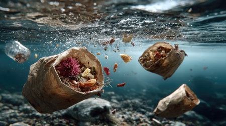 This captivating underwater image showcases organic waste bags surrounded by various plastic debris, highlighting the pressing issue of pollution in aquatic ecosystems.