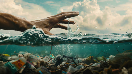 Plastic Waste In The Environment - Ocean Pollution - The fingers lift the water over the edge, and underneath it is depicted garbage and plastic. Environmental pollution