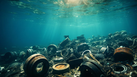 Pile of dirty garbage car tires and waste trash under sea. Generative AI.