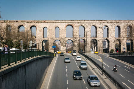 Istanbul, Turkey - March 22, 2015: Traffic under the Valens Aqueduct in Istanbul, Turkey