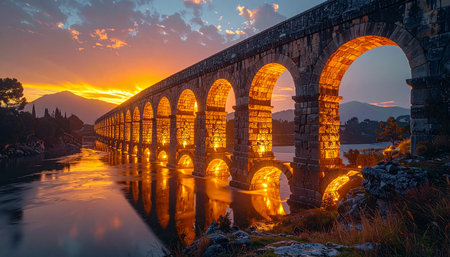 As the sun sets behind distant mountains, casting a warm glow across the sky, an ancient Roman aqueduct stands illuminated. Its majestic arches are perfectly reflected in the calm water below, a timeless testament to engineering marvels and the enduring legacy of a bygone empire.