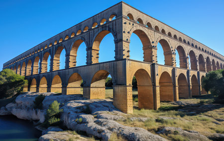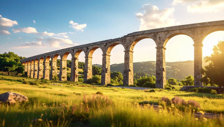 Roman aqueduct's monumental arches in sun-drenched countryside